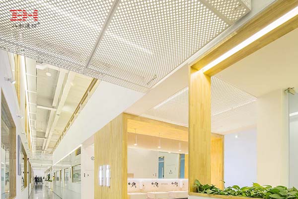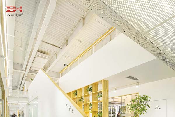 項(xiàng)目?jī)?nèi)部大量運(yùn)用了沖孔鋁單板進(jìn)行裝飾:白色的沖孔鋁單板被運(yùn)用在天花、墻面,也被改造成護(hù)欄,沖孔鋁單板作為裝飾建材既有較高的硬度與強(qiáng)度的也使建筑空間具有通透性。