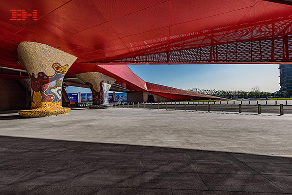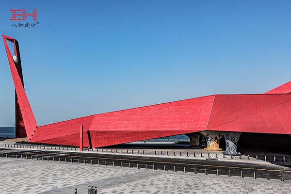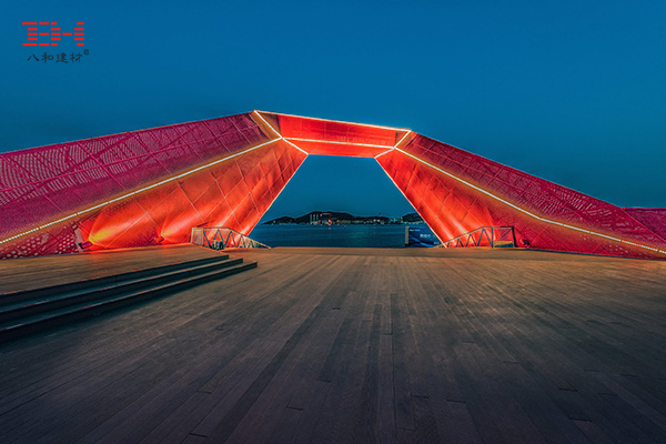 案例欣賞:紅色沖孔鋁單板裝飾青島萬達(dá)維多利亞灣棲鳳橋