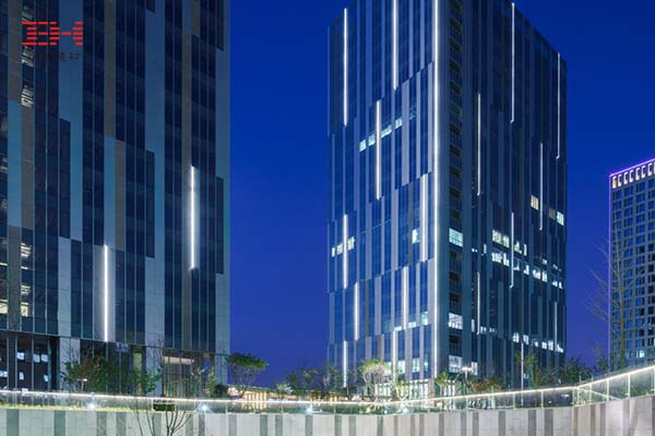 幕墻選用蘋果銀鋁板,內部大堂墻面亦采用褶皺平緩的鋁板,相互呼應。辦公樓鋁板、玻璃、燈光構建的二進制設計,現(xiàn)代感金屬感科技感融于一體,無論白晝明暗、遠近高低,都彰顯建筑美感。