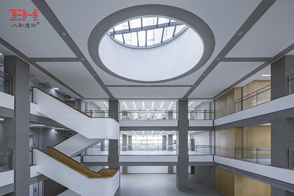 清華大學(xué)法學(xué)院圖書館內(nèi),多個開放性公共空間天花采用了鋁單板吊頂裝飾,包括入口中庭、大坡道閱覽室、閱覽室等。銀白色鋁單板吊頂與窗外藍天白云十分匹配,與周邊露臺及分區(qū)景觀同樣協(xié)調(diào)。