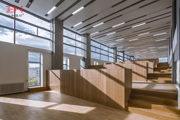 鋁單板天花吊頂裝飾符合開放空間的開敞通風(fēng)特性,加上一系列的寬大坡道,階梯式座位區(qū)以及落地大窗,創(chuàng)造舒緩、平靜的閱讀環(huán)境,營造高大、氣勢磅礴的場館形象。光潔的鋁單板吊頂、明亮的自然采光,創(chuàng)造了一個可高效利用的空間,讓師生在其中自由無拘、連續(xù)穿行。