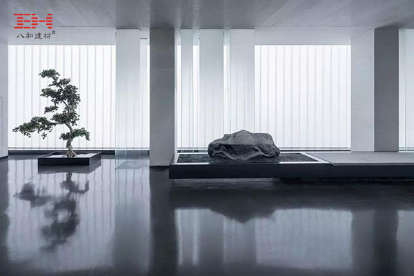 建筑設(shè)計采用極簡主義手法,以大塊面黑白色調(diào),渲染無隔斷的流動空間氛圍。細(xì)節(jié)之處運用鏡面反射的方式,將鏡面與山石、雕塑、樹景有機(jī)結(jié)合。透過光影的力量,呈現(xiàn)材質(zhì)肌理的變化,波光粼粼的漣漪,讓剛?cè)嶂涝趫龅刂薪豢棇υ挕?/p>
