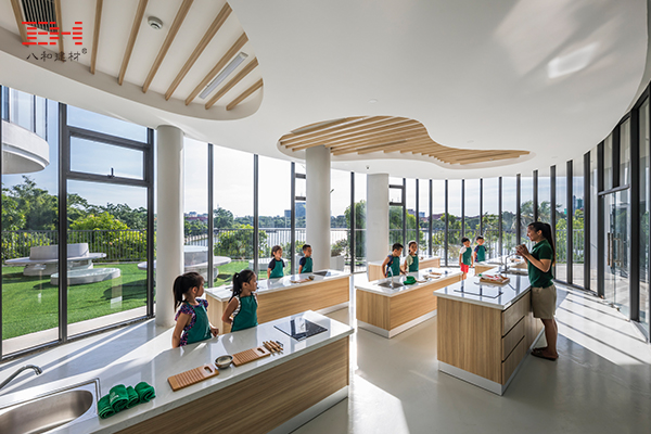 越南生態(tài)兒童幼兒園旨在為兒童提供鼓勵(lì)好奇心、基于活動(dòng)的學(xué)習(xí)和與自然互動(dòng)的空間。幼兒園內(nèi)部天花多處采用鋁方通吊頂、弧形鋁方通,基于自然及其結(jié)構(gòu)幾何的設(shè)計(jì)語言,激發(fā)孩子對(duì)有趣世界的探索。