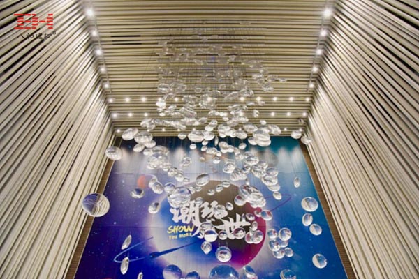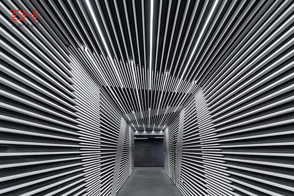 其中客服區(qū)三面鋁管墻面與中間懸掛的藝術(shù)裝置相映襯,在燈光效果下流光溢彩。而休閑區(qū)O型鋁圓管裝飾的三面背景墻,給人以身心舒適的藝術(shù)感受。通道條形鋁方管疊加的層次感加上條形燈光,則有種時光隧道的感覺,使人對穿越后的世界滿懷期待。