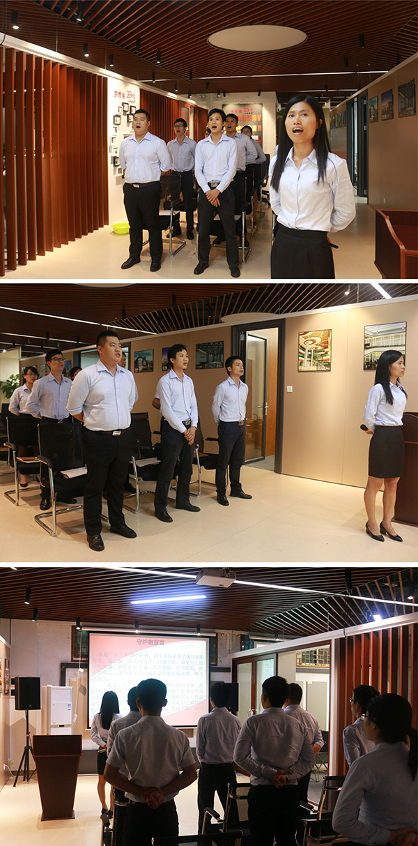 下午兩點(diǎn),會(huì)議準(zhǔn)時(shí)開(kāi)始。首先開(kāi)始的是唱國(guó)歌和朗讀守護(hù)者宣言環(huán)節(jié)。有國(guó)才有家,每個(gè)人永遠(yuǎn)要把祖國(guó)放在心中,同時(shí)八和建材是一個(gè)大家庭,我們作為這個(gè)大家庭的一員,要用自己的力量去守護(hù)這個(gè)大家庭。