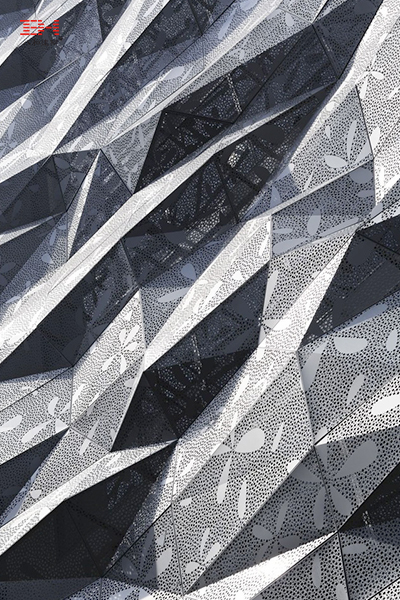 建筑采用了雙層表皮結(jié)構(gòu),由玻璃幕墻和藝術(shù)外墻鏤空鋁單板組成。立面成為室內(nèi)裝飾的一部分,并避免了窗簾或百葉窗等窗戶處理的需求。通過(guò)使用雙層表皮,也減少了空調(diào)負(fù)荷和玻璃清潔的負(fù)擔(dān)。通過(guò)計(jì)算設(shè)計(jì),單個(gè)藝術(shù)外墻鏤空鋁單板具有不同的角度和形狀,但都符合一種標(biāo)準(zhǔn)尺寸,使其擁有杰出的的材料產(chǎn)量。彩色LED頂燈安裝在雙層表皮內(nèi),根據(jù)季節(jié)的不同,讓路過(guò)的的行人體驗(yàn)到不同的氛圍。