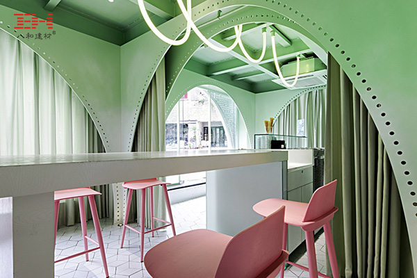 白天,陽光從穿孔鋁板穿進(jìn)室內(nèi),使得店內(nèi)原本甜美的配色和氛圍更加夢幻。晚上,室內(nèi)燈光透過穿孔鋁單板外泄,輕盈獨(dú)特的感覺引人駐足。古老的廠房背景,金屬感的沖孔鋁板,老建筑與現(xiàn)代設(shè)計展現(xiàn)在同一空間,以相互尊重的態(tài)度并存。