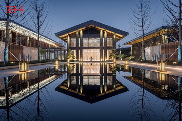 作為承接內(nèi)外的會所,用內(nèi)斂的精神展示開放的形象更易被世人接受,團隊選擇了中式的建筑風格,大面積的落地玻璃又展示了其開放的一面。