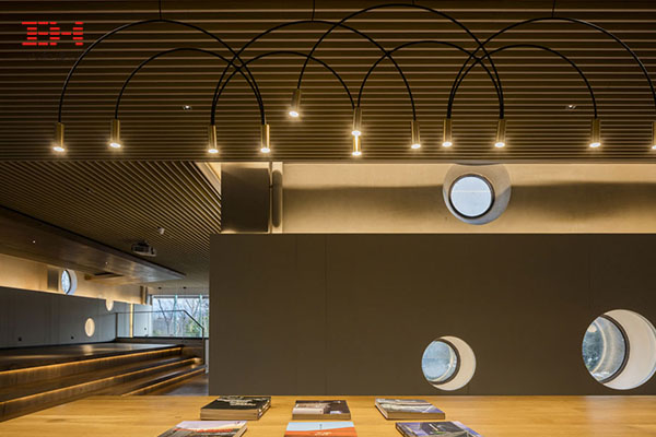 選用木紋鋁方通裝飾天花吊頂,辦公和休閑屬性兼具,通透的視野,簡潔的表達方式,木紋色的基調(diào)延續(xù)室外景觀。木紋鋁方通具有仿木紋的裝飾功能,可替代木材,相較于原木具有防火、防潮、環(huán)保、壽命長等優(yōu)點。