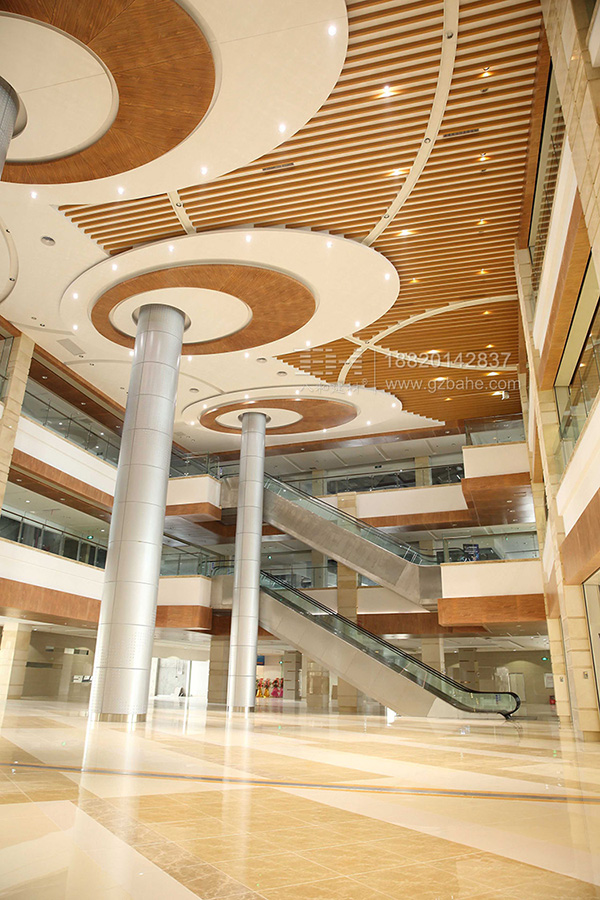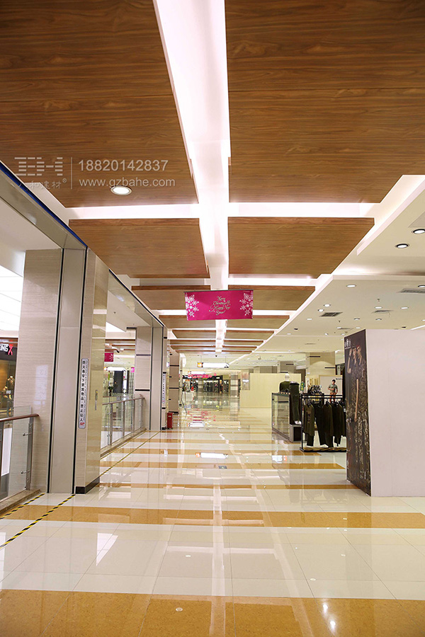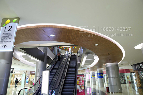 虎門(mén)國(guó)際購(gòu)物中心天花采用了造型木紋鋁單板,木紋鋁方通,在LED等的照亮下,讓整個(gè)購(gòu)物中心充滿(mǎn)了創(chuàng)意的色彩,給逛街的顧客一種高檔購(gòu)物中心的感覺(jué)。
