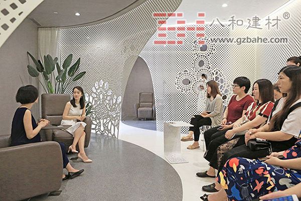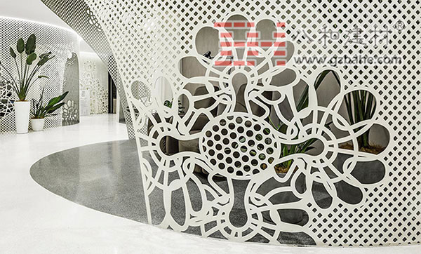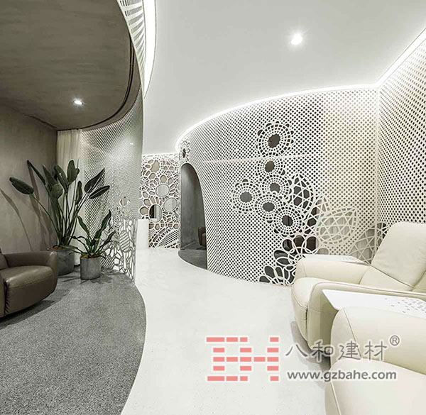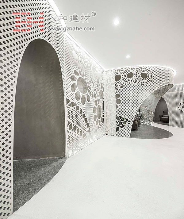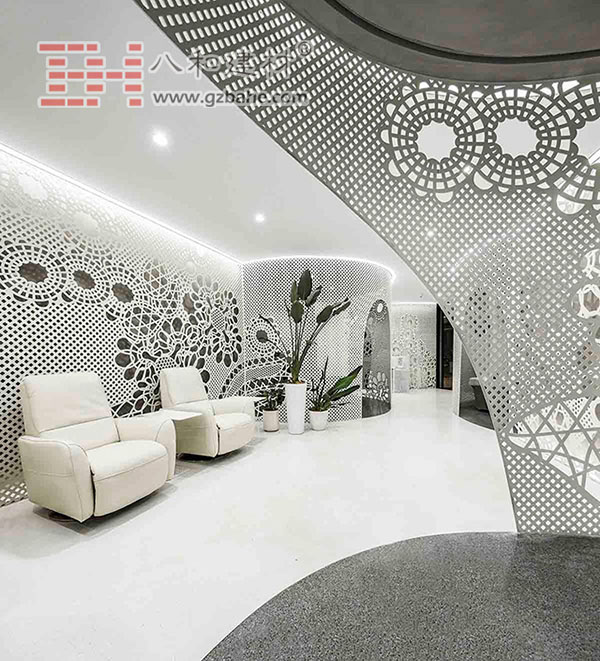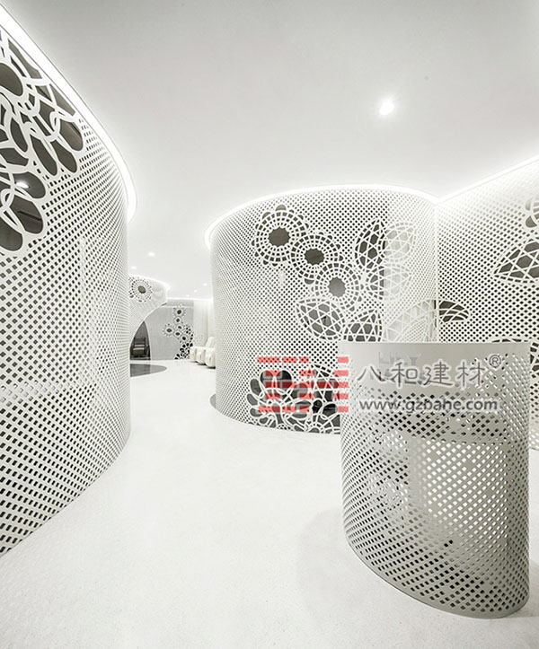 在中國北京朝陽區(qū),八和建材已經(jīng)完成了一個新的內(nèi)部空間,里面有穿孔的流動墻壁,采用的是八和建材鏤空弧形鋁板制成。新的百合美甲沙龍的空間被劃分為不同的空間——通過持續(xù)的墻壁來創(chuàng)造柔韌的環(huán)境和女性氣質(zhì),以及改善指甲沙龍的身份和舒適性。