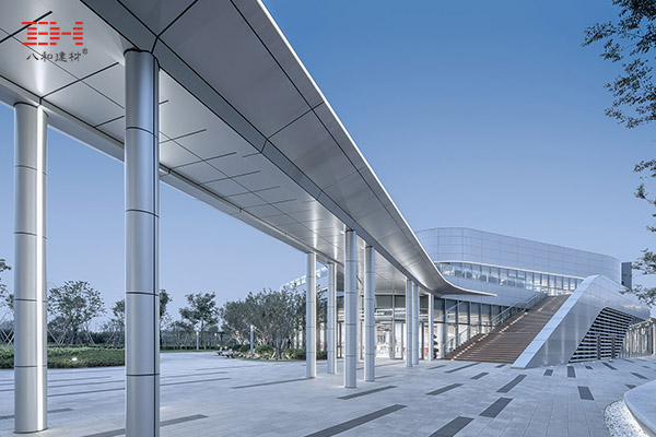 包柱鋁單板跟雨棚鋁單板、大樓幕墻鋁單板一脈相承,使得兩棟建筑有機(jī)結(jié)合為一體。在裝飾效果上,連廊成為一道靚麗的風(fēng)景線,填補(bǔ)建筑間的空白。包柱鋁單板所呈現(xiàn)的質(zhì)感、金屬感,猶如汽車外漆,盡管色彩單調(diào),卻不失光華。