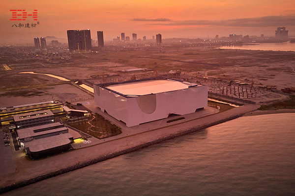 又見(jiàn)馬六甲劇場(chǎng)外表面主要由50000余片菱形鋁單板白色鱗片組合而成。頂部凹入的若干弧體由12000余片共1800平米異形弧面玻璃幕墻包裹,既可反射周邊環(huán)境又能借助LED變化而自成氣象。