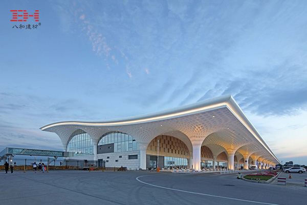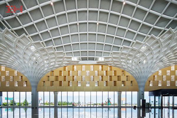 內(nèi)蒙古呼倫貝爾海拉爾機(jī)場(chǎng)新航站樓設(shè)計(jì)獨(dú)特,框架柱在二層呈雙V形斜撐支撐屋面,營(yíng)造一個(gè)連綿的蒙古大帳形狀的頂棚,室內(nèi)天花以O型鋁圓管為材料,由框架柱向天花延伸,連綿如置身于白樺林般。