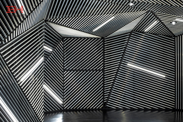 新加坡RACE機(jī)器人實(shí)驗(yàn)室整個(gè)室內(nèi)墻面和天花均由O型鋁圓管裝飾,O型鋁圓管斜向排列成一個(gè)個(gè)平面,平面之間按不同角度放置,間插條形燈管,鋁管貫穿整個(gè)室內(nèi),整個(gè)空間充滿著未來感。