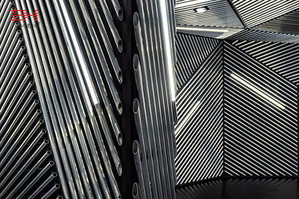 O型鋁圓管打造的第二層表皮,通過解構(gòu)天花和墻面,形成多面陳列,創(chuàng)造了一個(gè)動態(tài)的室內(nèi)空間,充滿了金屬感、科技感和未來感。