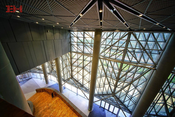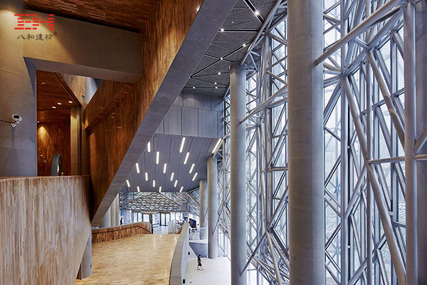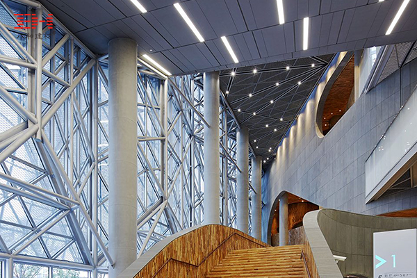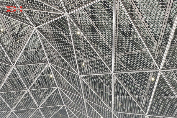上海虹橋藝術(shù)中心的東立面和南立面,采用了玻璃加鋁金屬拉伸網(wǎng)幕墻的幕墻系統(tǒng),相應(yīng)的空間內(nèi)部采用鋁金屬拉伸網(wǎng)天花吊頂與之呼應(yīng),無(wú)論室內(nèi)室外,建筑的美觀和通透性都得到了很大的提升。