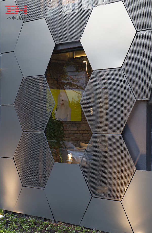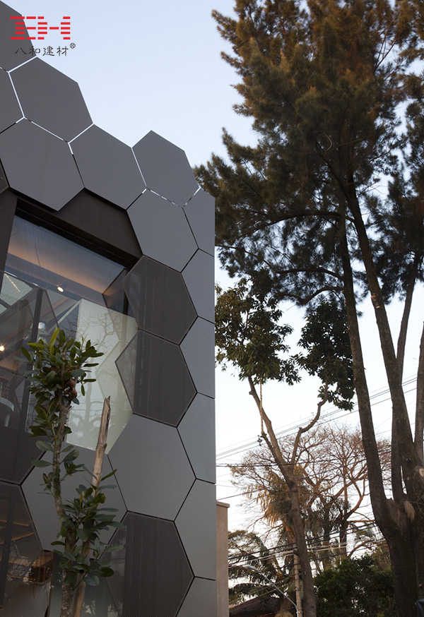 巴西圣保羅Estar Móveis商店位于街道轉(zhuǎn)角處,這個(gè)商店體現(xiàn)了時(shí)代性元素與品牌性語(yǔ)言,在其產(chǎn)品及建筑上尋找一種新的美學(xué)語(yǔ)言。建筑主立面采用了金屬結(jié)構(gòu)塑造了一個(gè)開(kāi)敞的門(mén)面,頗為顯眼。門(mén)面采用了六邊形的蜂窩形式,使得面狀和曲線得到很好的結(jié)合。門(mén)面局部是不透明的,局部是透明的。建筑室內(nèi)的石墻和照明系統(tǒng)直接暴露在外,為產(chǎn)品展示提供更具靈活性的空間。