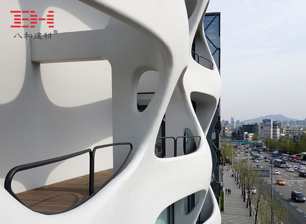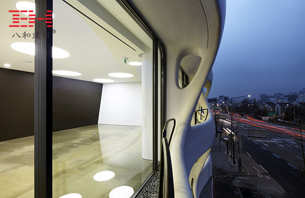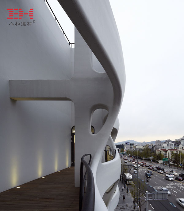 韓國首爾漢南洞HANDS公司總部作為這地段一個體量不算大的建筑,該項目要求具有一定的標志性。而建筑立面,作為城市的風(fēng)景組成之一,不允許行人或汽車之間形成視線交流。而該項目則是打破這一陳規(guī),讓環(huán)境(行人、居民)與建筑之間形成自然的視線交流,加強該建筑在城市風(fēng)景中的作用。曲線的形式也增加了停留者對空間產(chǎn)生的趣味性,看似混亂的波浪面,實則相同顏色的面具有著相同的曲率,為制造加工減少了一定的負擔。