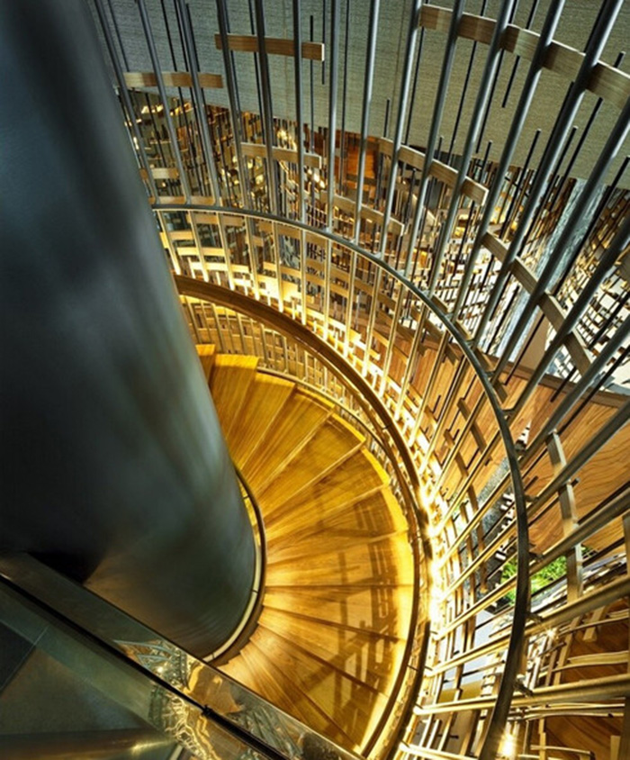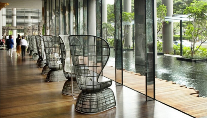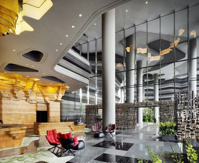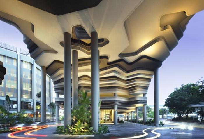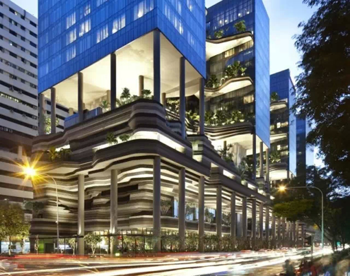 新加坡建筑事務(wù)所WOHA一直是綠色城市的倡導(dǎo)者,將綠色從自然引入城市。PARKROYAL on Pickering被設(shè)計成為一個率容量倍增的花園酒店,美麗的熱帶花木與棕櫚樹點綴著空中花園。如此繁榮茂盛的綠色與周邊公園連成一氣,形成連續(xù)的綠色景觀。整個設(shè)計中運用的裝飾材料,很好的表達了設(shè)計理念。