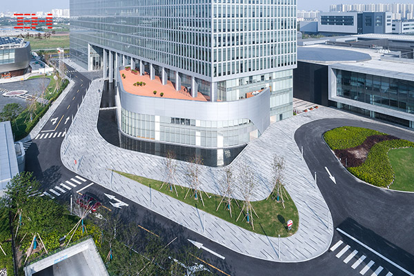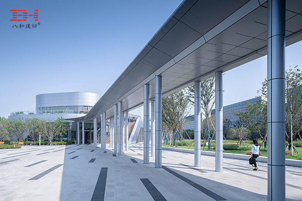鋁單板幕墻跟主體大樓一樣簡潔,方正的體塊體現(xiàn)理性和智慧的力量。鋁單板幕墻和玻璃幕墻工整有序的結合,構成建筑的主旋律,鋁板的銀白色與石材顏色相仿,因而使得園區(qū)建筑與周邊環(huán)境有機融為一體。園區(qū)連廊的鋁單板天花強調了建筑的流暢和通透,營造怡人的景觀。