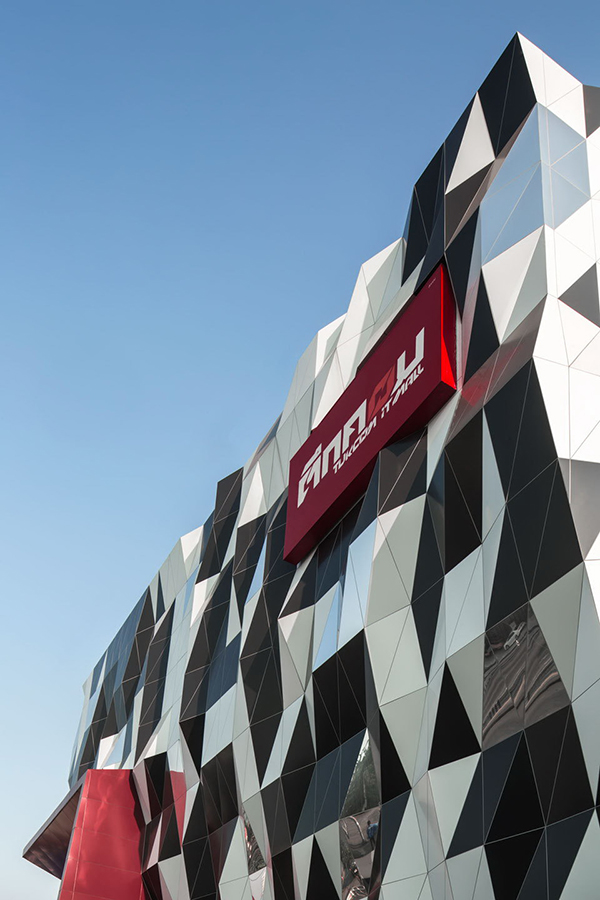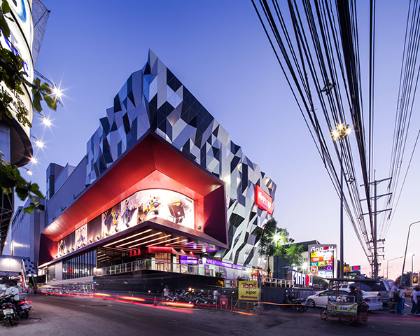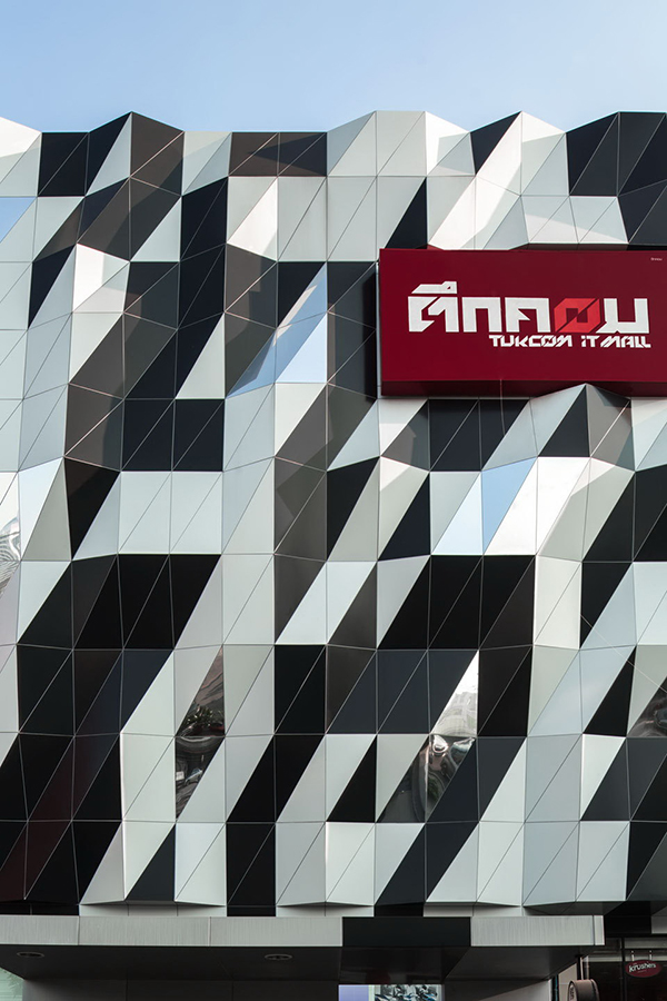 泰國TUKCOM商場的建筑外觀呈波浪形,運用了不同造型的鋁單板,分為765經(jīng)濟三角像素。黑色,白色和鏡面加工的鋁單板通過超時分布的隨機算法?,F(xiàn)有的廣告廣告牌已擴大沿一側(cè)外墻的建筑主入口前臉標志。
