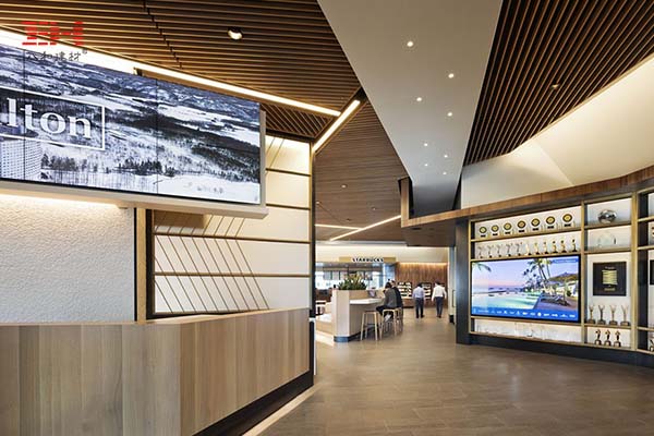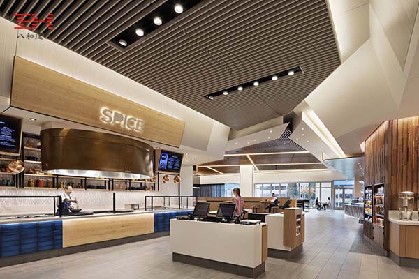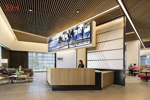 希爾頓總部的餐廳是一個(gè)休閑的社交場(chǎng)所,正如大多數(shù)購(gòu)物商場(chǎng)頂樓的餐飲區(qū)一樣,采用了主流的木紋型材鋁方通天花吊頂裝飾。同時(shí),木紋的自然材質(zhì)結(jié)合現(xiàn)代裝飾風(fēng)格,正是希爾頓的品牌特征,木紋鋁方通的裝飾亦常見(jiàn)于其旗下遍布全球的星級(jí)酒店。