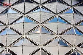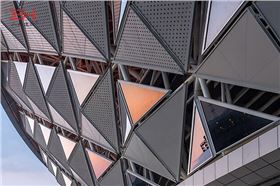 咸陽(yáng)奧體中心表皮由玻璃和穿孔鋁板組成,4mm厚銀灰色穿孔鋁單板和玻璃均為三角形,有規(guī)律地拼接成體育中心的藝術(shù)外表皮結(jié)構(gòu)。