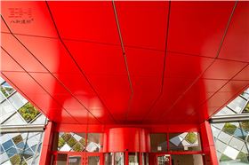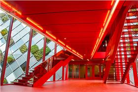 該項(xiàng)目旨在創(chuàng)建一種探索、移動(dòng)、獲取方位和工作的新方式。采用了這種方法,建筑師想以一種驚奇而創(chuàng)新的方式建造該項(xiàng)目。因此,連廊的大紅色鋁單板外表和天花裝飾并不突兀,而且十分巧妙,風(fēng)格鮮明。