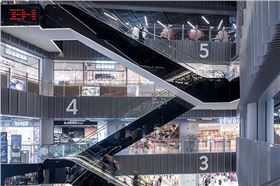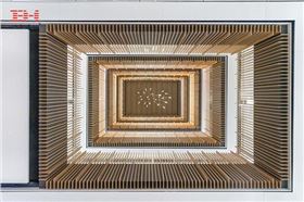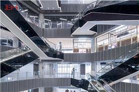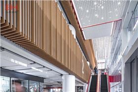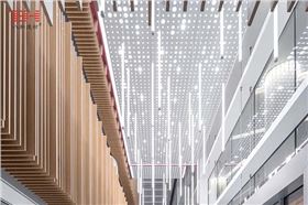 重新改造后的上海世貿(mào)中心室內(nèi),采用大量鋁單板進(jìn)行裝飾,其最具特色的是中庭處由鋁單板構(gòu)成的格柵造型飾面,其中東區(qū)中庭是偏暗色系工業(yè)風(fēng),西區(qū)格柵造型飾面則是木紋暖色調(diào),明快敞亮。