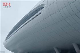 黃龍體育中心游泳跳水館外表皮采用弧形鋁單板裝飾。建筑輪廓依據(jù)內(nèi)部空間關(guān)系自然形成高低起伏的整體形態(tài),并通過立面檐口的自由曲線造型呈現(xiàn)一種未來建筑般的“漂浮感”。