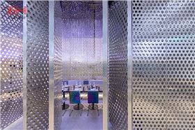 餐廳內(nèi)部的天花、幕墻、屏風(fēng)均選用了陽極氧化質(zhì)感的鋁合金裝飾材料。天花和小部屏風(fēng)運(yùn)用的是瓦楞鋁板,幕墻主體部分運(yùn)用了定制的雕花鋁單板,屏風(fēng)則是由沖孔鋁單板組裝而成的。設(shè)計(jì)師通過將這些表面通過了陽極氧化處理的鋁合金金屬建材有機(jī)結(jié)合,打造出了一個(gè)具有時(shí)尚感和現(xiàn)代感的餐廳。
