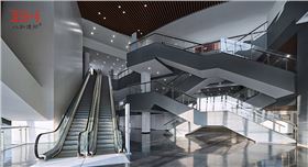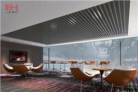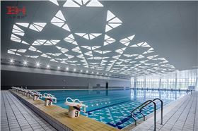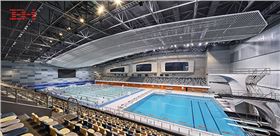 游泳館比賽大廳墻面采用灰色穿孔吸音鋁板,具有良好的吸聲效果。天花運用鋁圓通吊頂遮擋頂部機電結(jié)構(gòu),序列排布的流式線條與建筑表皮形態(tài)呼應。觀眾休息大廳墻面和天花皆采用易檢修、施工的鋁方通,整體效果簡潔明快、清新。