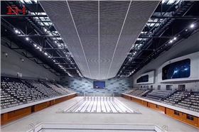 場館以“碧波帆船”為主題,室內(nèi)做仿生船艙龍骨,內(nèi)外呼應。觀眾休息大廳運用木紋鋁方通和金屬網(wǎng)形成虛實、序列的韻律空間。觀眾席墻面運用灰色穿孔吸音鋁板墻面和多功能照燈。