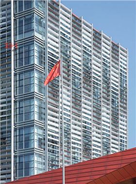 作為警察學(xué)校對外的主要界面,這樣的建筑立面具有極高的標(biāo)志性和很強的辨識度。此外,紅色的折形金屬屋面與規(guī)律漸變的遮陽鋁百葉,也作為建筑造型的主要元素而貫穿了整個校園建筑群,形成統(tǒng)一的建筑意象。
