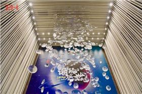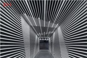 其中客服區(qū)三面鋁管墻面與中間懸掛的藝術(shù)裝置相映襯,在燈光效果下流光溢彩。而休閑區(qū)O型鋁圓管裝飾的三面背景墻,給人以身心舒適的藝術(shù)感受。通道條形鋁方管疊加的層次感加上條形燈光,則有種時(shí)光隧道的感覺,使人對(duì)穿越后的世界滿懷期待。