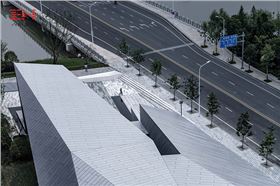 灰白色鋁單板與周圍環(huán)境色調(diào)統(tǒng)一,又格外出眾,凸顯翡翠館文化內(nèi)涵的厚實(shí)感。山石的形態(tài),雕塑化的形體,在鋁單板的裝飾下,使其成為地標(biāo)性的景點(diǎn),吸引人群從而為建筑注入幾分活力。