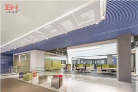 整個項目以佳德的企業(yè)色,天空的“藍(lán)色”和工藝管道的“黃色”作為主色調(diào)貫穿。室內(nèi),作為視線入口引導(dǎo),把外立面的藍(lán)色元素引入室內(nèi),讓“藍(lán)天”無處不在。運用簡單流暢的鋁方通線條貫穿整個空間,一氣呵成??臻g色調(diào)上選用頗具科技感銀白色作為基調(diào),讓空間的線條感與純凈的色調(diào)相映成輝,突顯企業(yè)追求純粹而堅定的環(huán)??萍假碓福彩沟每臻g富有未來科技感。