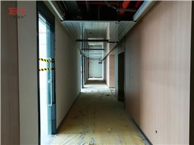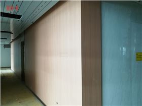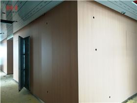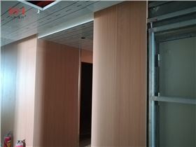 寫字樓常用的天花墻面裝飾搭配:勾搭式鋁瓦楞板天花+木紋鋁蜂窩板墻面板。