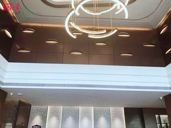 廣州希爾頓歡朋酒店裝飾工程,由八和建材提供鋁裝飾材料,并提供設(shè)計安裝服務(wù)。其大門雨搭天花采用八和建材沖孔鋁單板,室內(nèi)墻面根據(jù)功能區(qū)不同選用木紋鋁單板和巧克力色鋁單板。