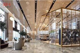 巨大而通透的房子形狀的裝置構(gòu)架很好的減弱了層高過高帶來的空曠感。沖孔鋁單板的透明的立面架構(gòu)是“圍”與“透”的結(jié)合,打破了原有的景觀結(jié)界,使整個(gè)空間被完美通透的呈現(xiàn)。