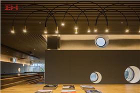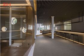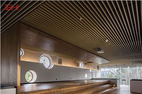 選用木紋鋁方通裝飾天花吊頂,辦公和休閑屬性兼具,通透的視野,簡潔的表達方式,木紋色的基調(diào)延續(xù)室外景觀。木紋鋁方通具有仿木紋的裝飾功能,可替代木材,相較于原木具有防火、防潮、環(huán)保、壽命長等優(yōu)點。