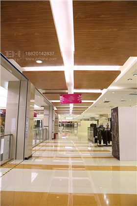 虎門國際購物中心天花采用了造型木紋鋁單板,木紋鋁方通,在LED等的照亮下,讓整個購物中心充滿了創(chuàng)意的色彩,給逛街的顧客一種高檔購物中心的感覺。