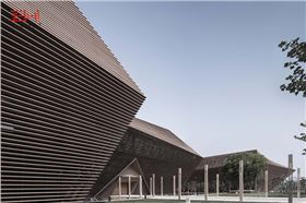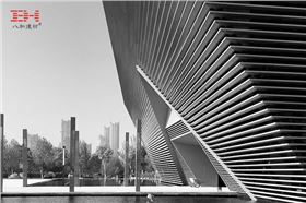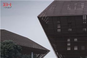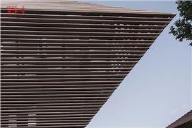 幕墻鋁方通格柵呈古銅色,均勻地橫向排列,構(gòu)建起三個(gè)場館的建筑表皮。金屬格柵幕墻的鏤空特性可以使陽光透進(jìn)館內(nèi),營造生動(dòng)的視覺感受,配合建筑形態(tài),呈現(xiàn)一種動(dòng)態(tài)的富有張力的空間秩序。