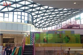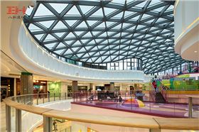 嘉興合樂城,建筑面積110000平米,是一個大型綜合購物中心,其中庭大而空曠,設(shè)置了一個1500平米的大型生態(tài)中央廣場。中庭頂棚是由型材鋁方管組成的三角形鋁格柵天花加玻璃的結(jié)構(gòu),為室內(nèi)采光和視野提供便利的同時,塑造了一個美觀、藝術(shù)的天花裝飾。