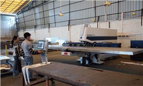 德國(guó)“通快”全自動(dòng)數(shù)控沖床是一種用于鋁單板鈑金成型或分離的數(shù)控加工設(shè)備,把待加工的鋁板材夾持在夾鉗上,使鋁單板材在上、下轉(zhuǎn)盤之間相對(duì)于滑塊中心沿X,Y軸方向移動(dòng)定位,按規(guī)定的程序選擇所需要的模具,并由滑塊沖擊模具,從而沖出所需尺寸和形狀的孔來(lái)。這是一種通用、高效、精密的沖壓機(jī)械,也是鋁單板板材加工中的主要設(shè)備。