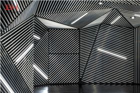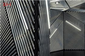 新加坡RACE機(jī)器人實驗室整個室內(nèi)墻面和天花均由O型鋁圓管裝飾,O型鋁圓管斜向排列成一個個平面,平面之間按不同角度放置,間插條形燈管,鋁管貫穿整個室內(nèi),整個空間充滿著未來感。