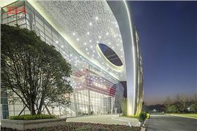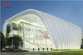 重慶房地場(chǎng)職業(yè)學(xué)院圖書館正立面是個(gè)瀑布狀的平行四邊形鋁板結(jié)構(gòu),通過平面角度的變化,形成鋸齒狀的平面效果,在陽(yáng)光照耀下,有著豐富的光影變化。