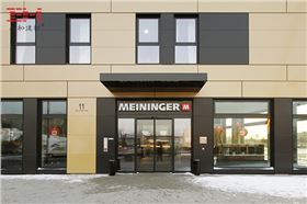 德國Meininger酒店坐落在法蘭克福的MK14發(fā)展區(qū)之中。大樓共有八層,大樓的長度大約45米哦,寬度大約14米,大樓的東西方向沿著Bessie Coleman路,大樓在西邊逐漸變得尖細。外墻的包層是各種大的、支持通風的金屬薄片(鋁單板幕墻)。窗戶幾乎是全高的,窗戶被向后移動了10厘米左右的距離,與另一個正面相對,并被嵌入了不規(guī)則的水平墻壁中。建筑的正面被包上了一層淺金色,后部則是一層黑古銅色。窗戶的護墻由青銅色的角塊和玻璃板制成。