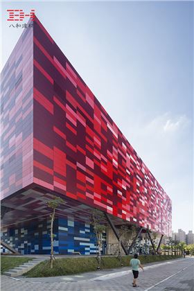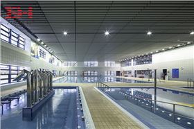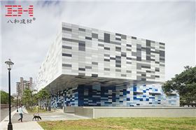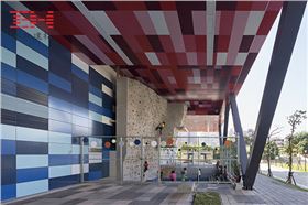 臺(tái)灣土城國(guó)民運(yùn)動(dòng)中心由三個(gè)體塊相互咬合而成,紅色的體塊(籃球館)和灰色的體塊(冰上曲棍球場(chǎng))從藍(lán)色的體塊(游泳館)外挑出了9米,從而形成了連續(xù)的半室外空間,可以供休閑漫步、室外攀巖和街舞等活動(dòng)使用。該建筑的外立面是由一種復(fù)合的窗戶(hù)/墻系統(tǒng)組成,它的前面是鋁單板幕墻,而后面則是玻璃,室內(nèi)采用鋁方通吊頂天花,這樣一方面能夠讓陽(yáng)光柔和地進(jìn)入室內(nèi),另一方面能讓使用者可以通過(guò)玻璃更好的看到室外,而室外的人卻難以看到室內(nèi),從而提供了較好的私密性。此外,外立面由一系列的漸變色組成,不同顏色的鋁單板幕墻拼在一起,起到很好的裝飾效果。室內(nèi)的八和建材鋁方通吊頂天花,有效的屏蔽上面的設(shè)施,線(xiàn)條飄逸,通透、典雅、高貴,功能疊加,具有透氣,散熱等功能,外形具有藝術(shù)的氣質(zhì)。